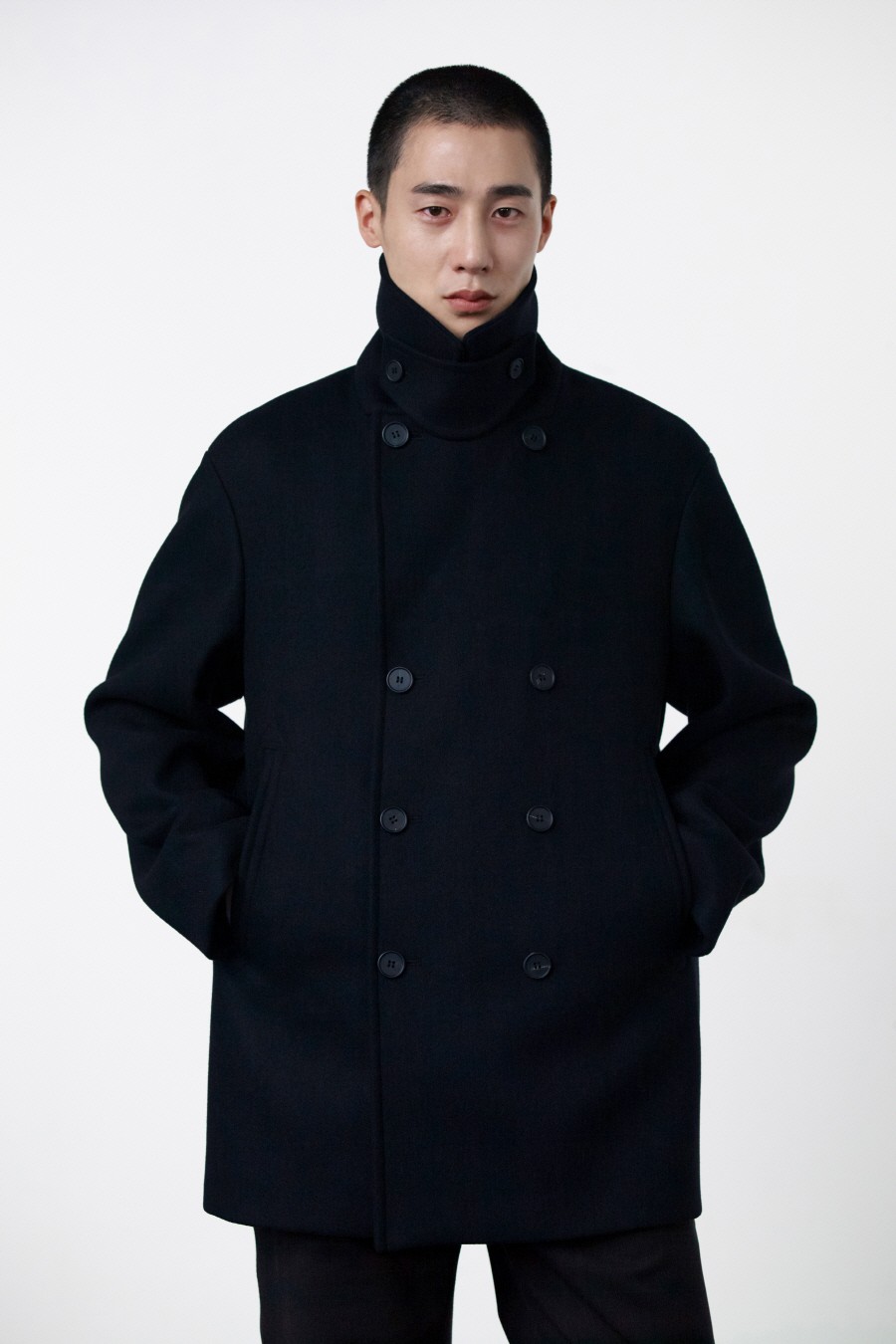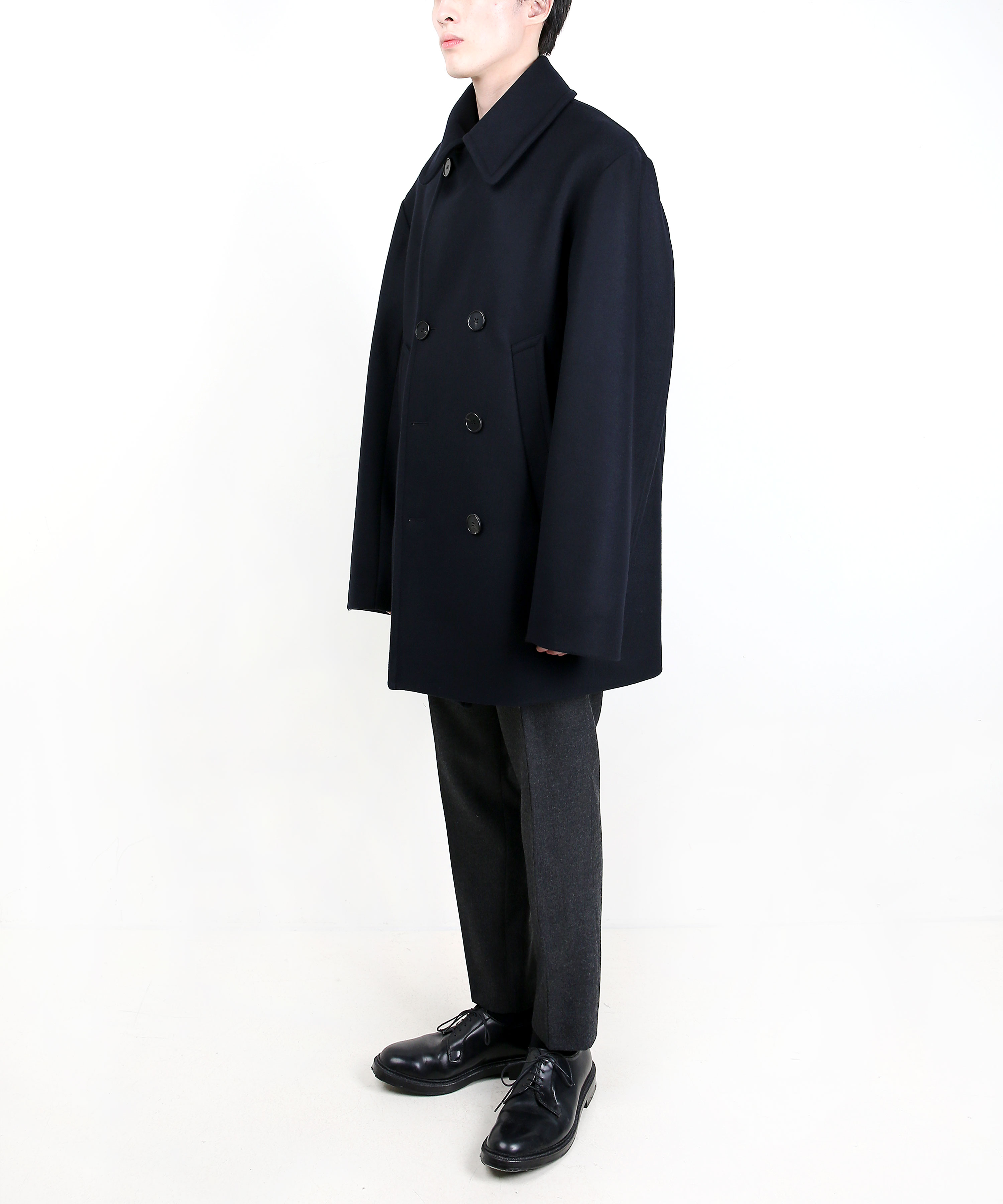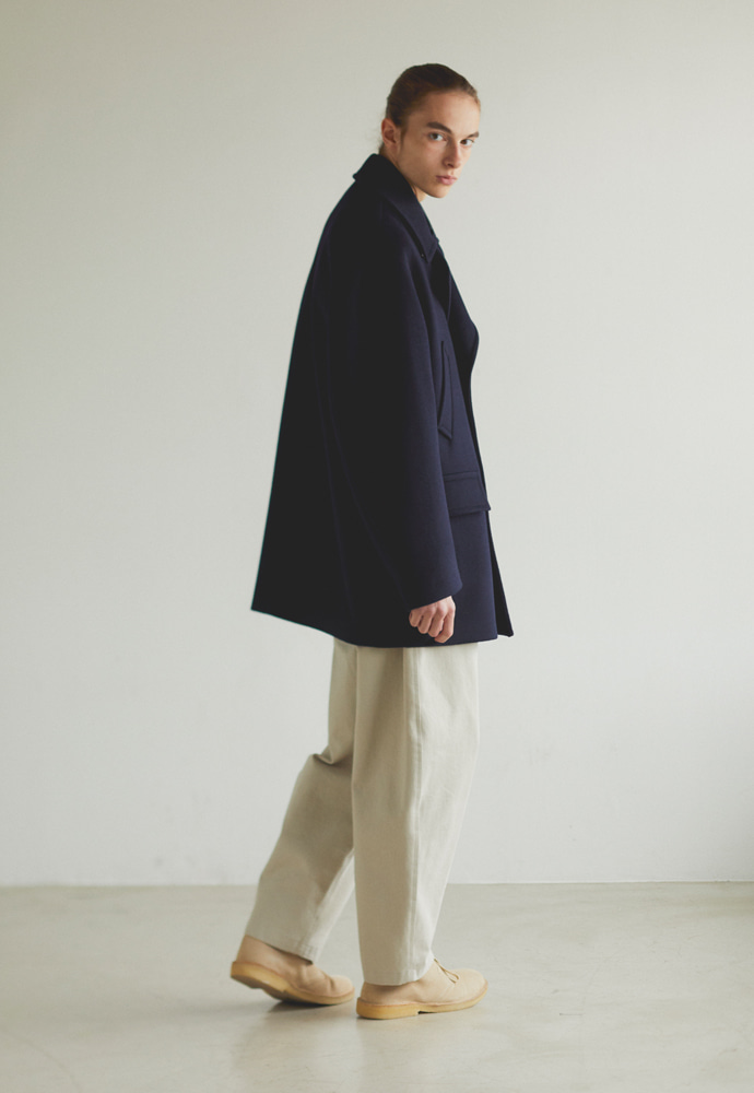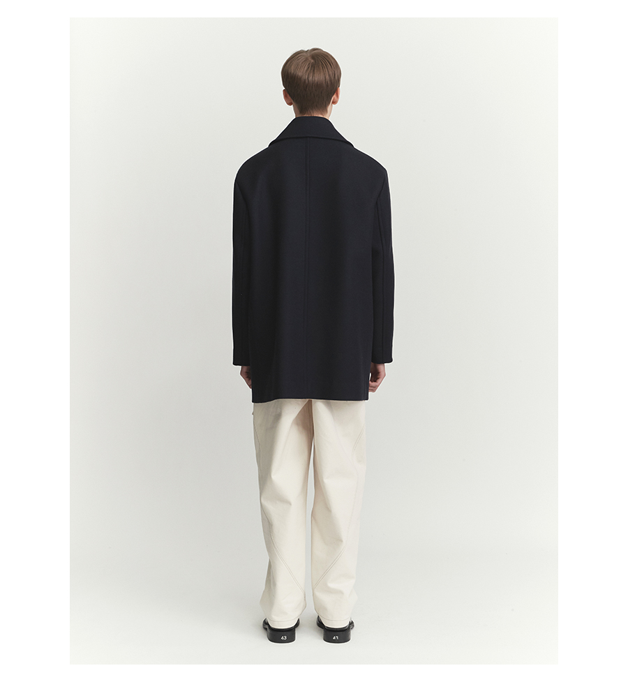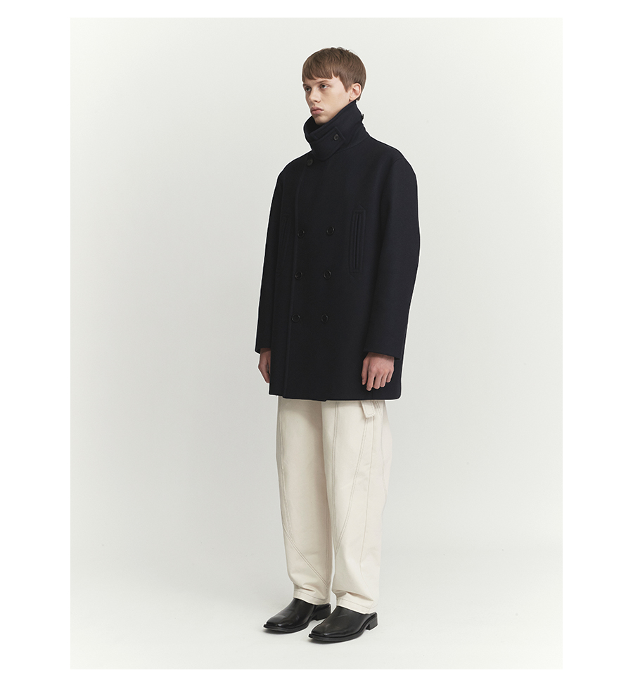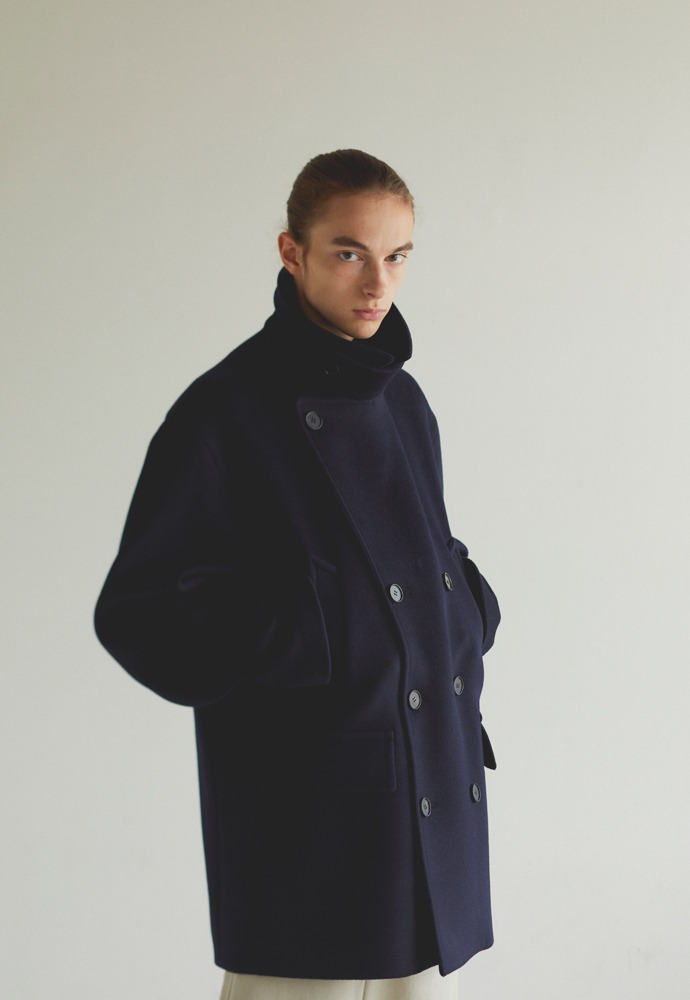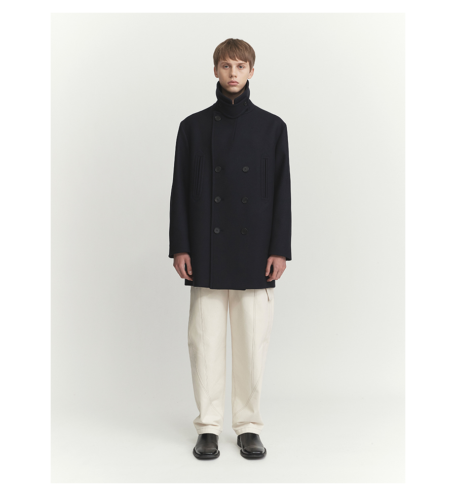 기존 피코트에 비해 살짝 더 긴(엉덩이를 덮는) 기장에 여유로운 핏감을 보여주는 코트.