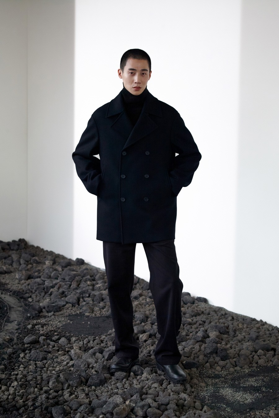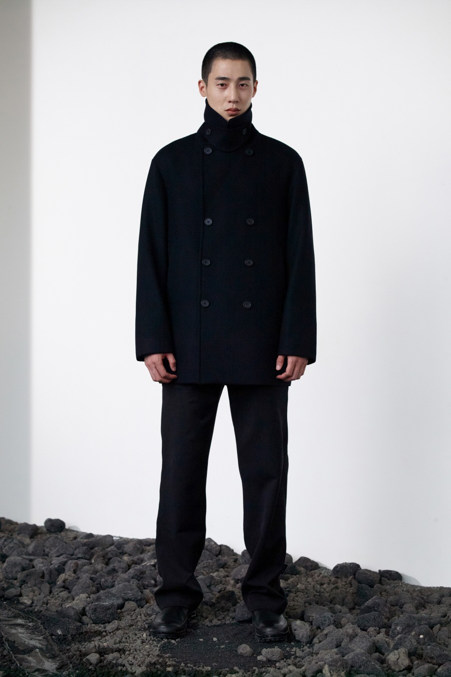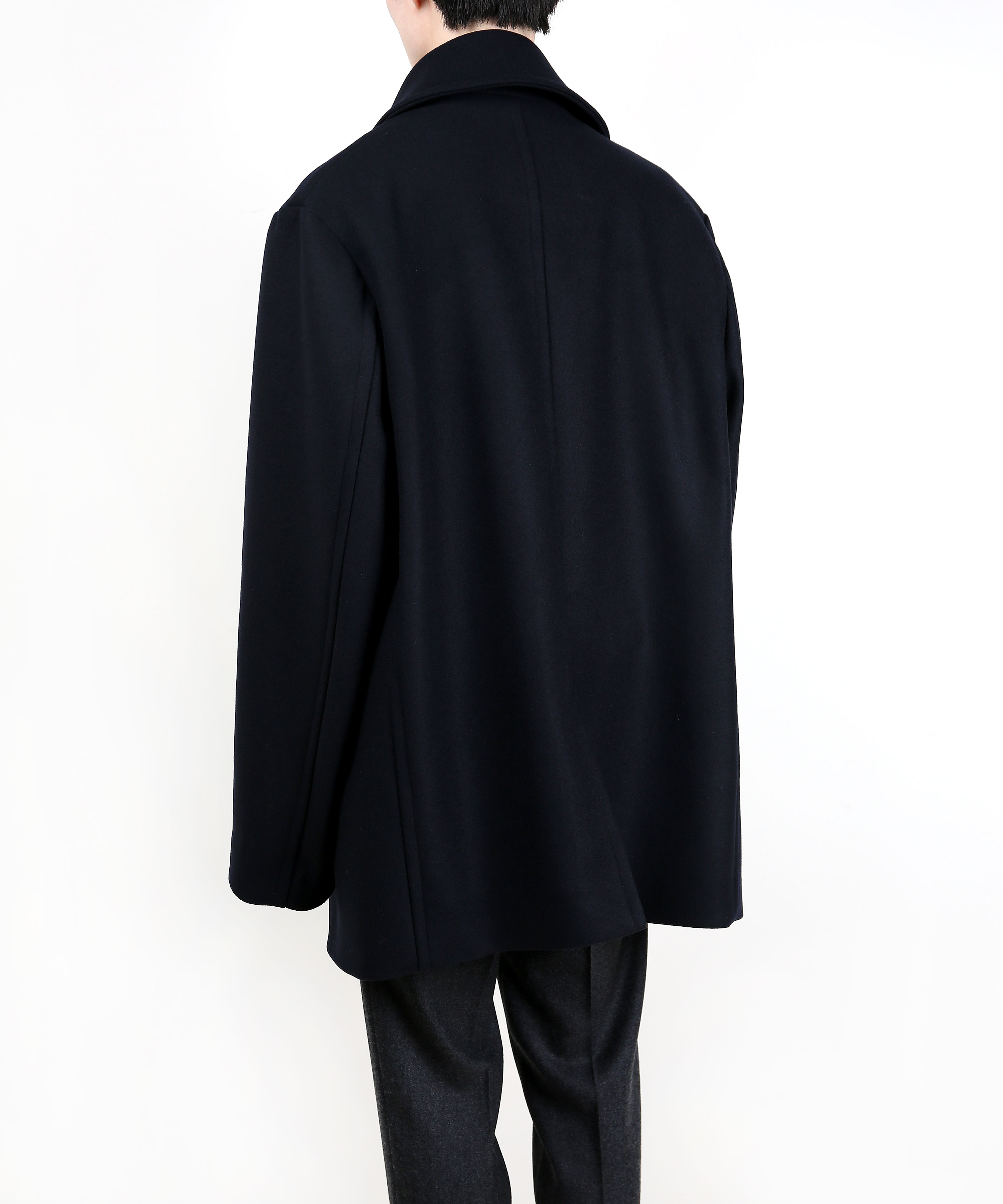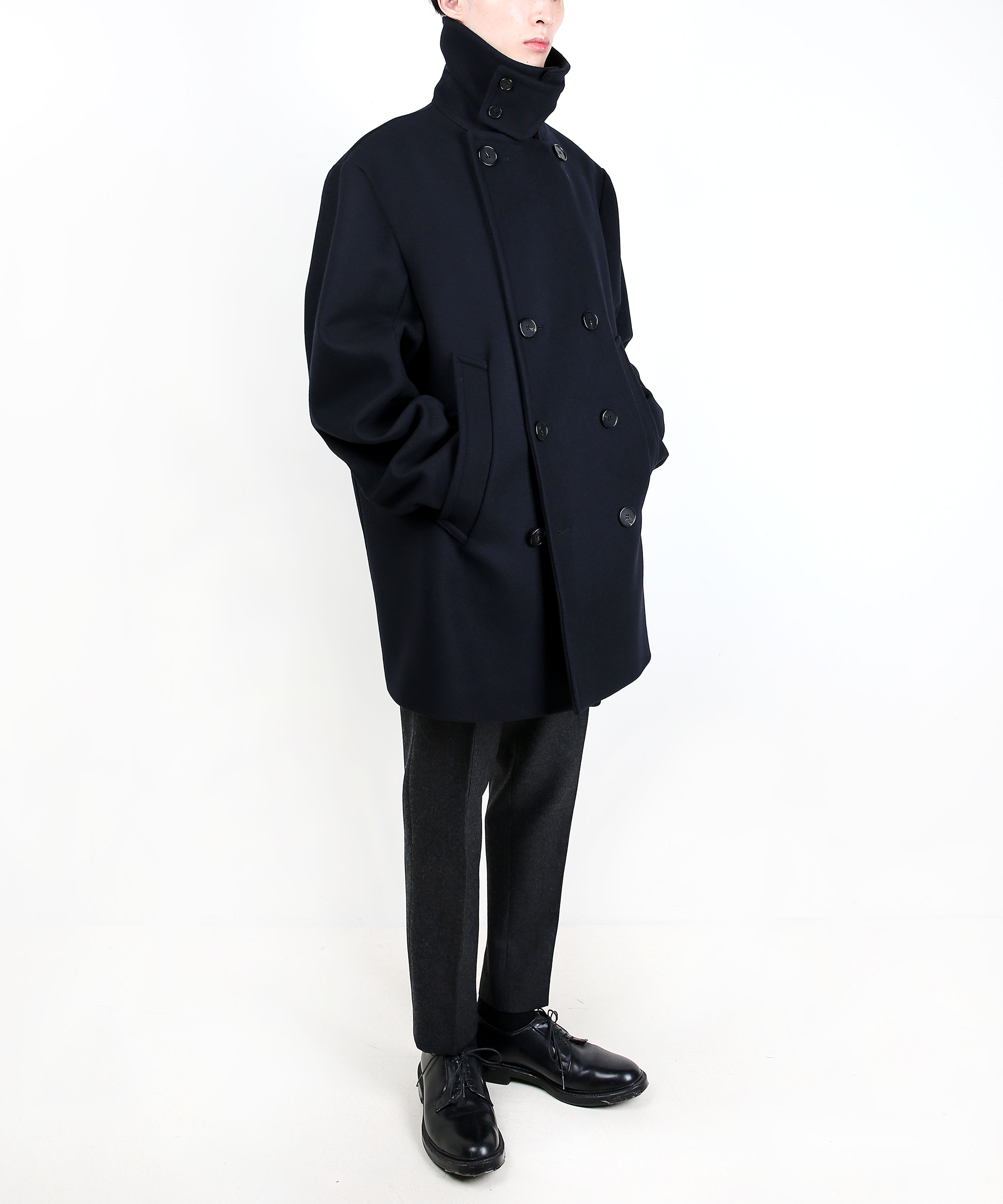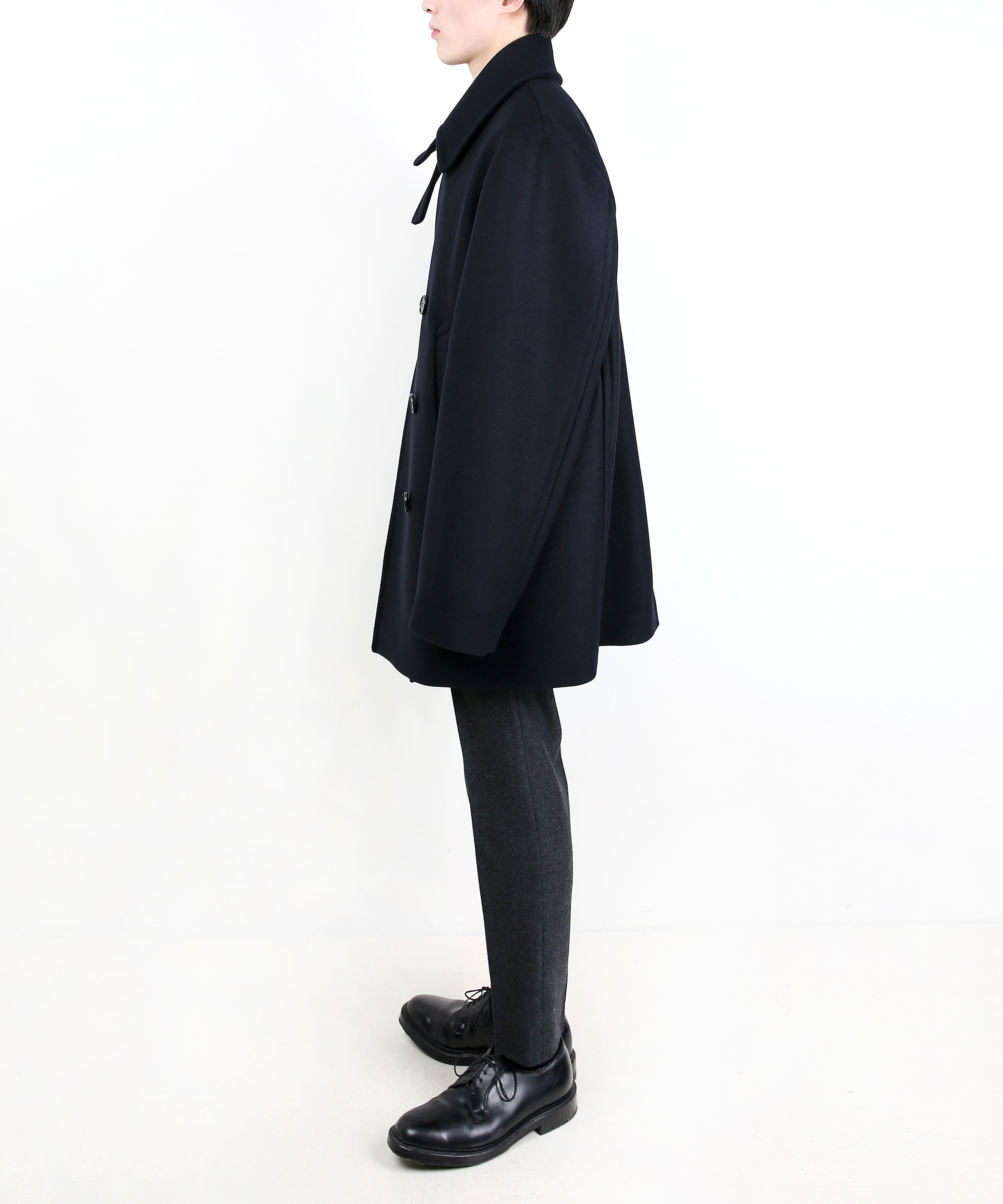 기존 피코트에 비해 살짝 더 긴(엉덩이를 덮는) 기장에 여유로운 핏감을 보여주는 코트.