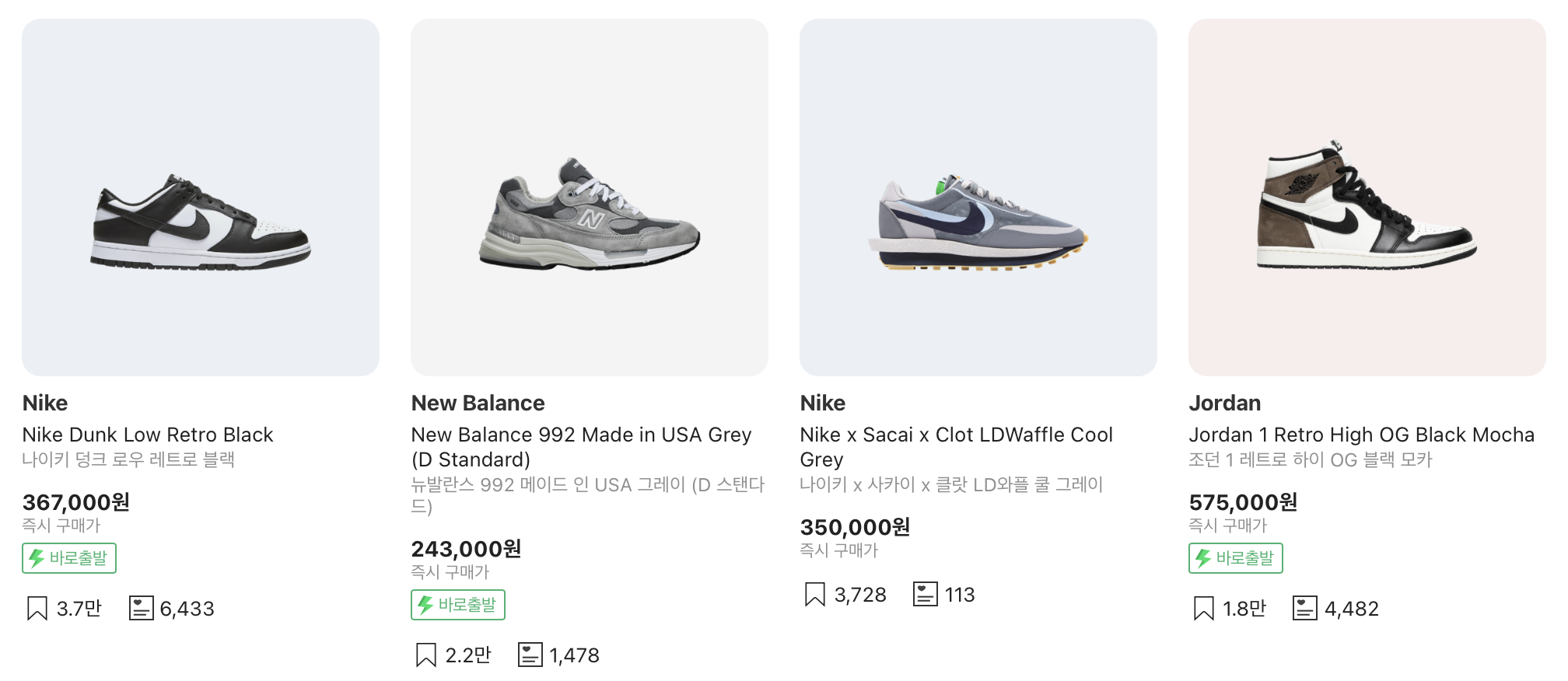 'KREAM' 인기순 상위 4개 모델 '덩크', '992', '사카이', '조던' - 스니커즈 중개 플랫폼 'KREAM'의 상위 4개 모델이다.