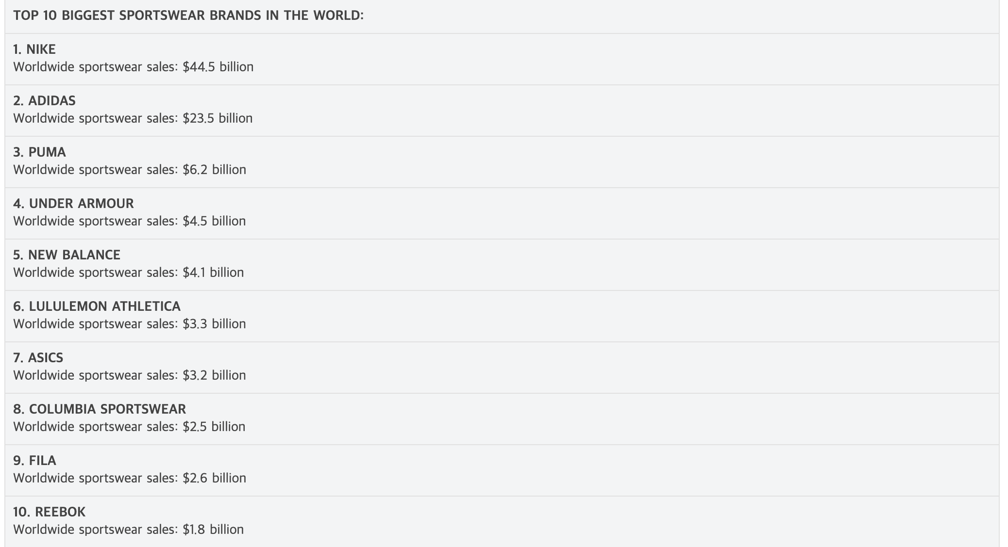 나이키, 아디다스, 푸마가 스포츠 브랜드 1,2,3위라는 것이 당연시될 정도로
