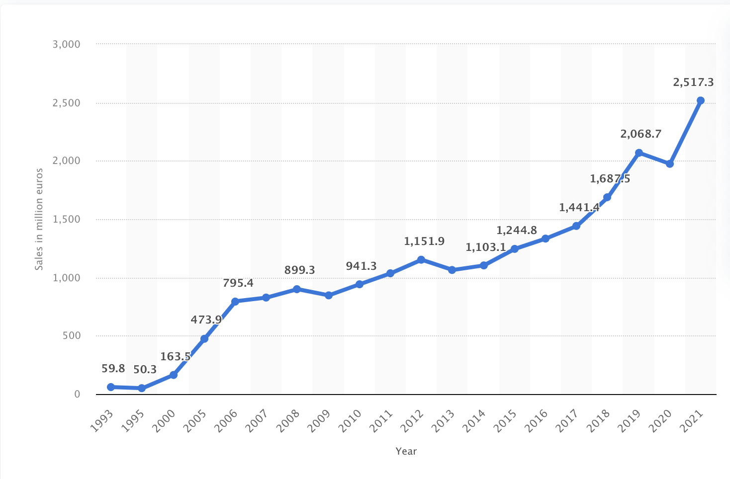 statista.com 푸마의 판매고는 꾸준히 우상향 중에 있다.