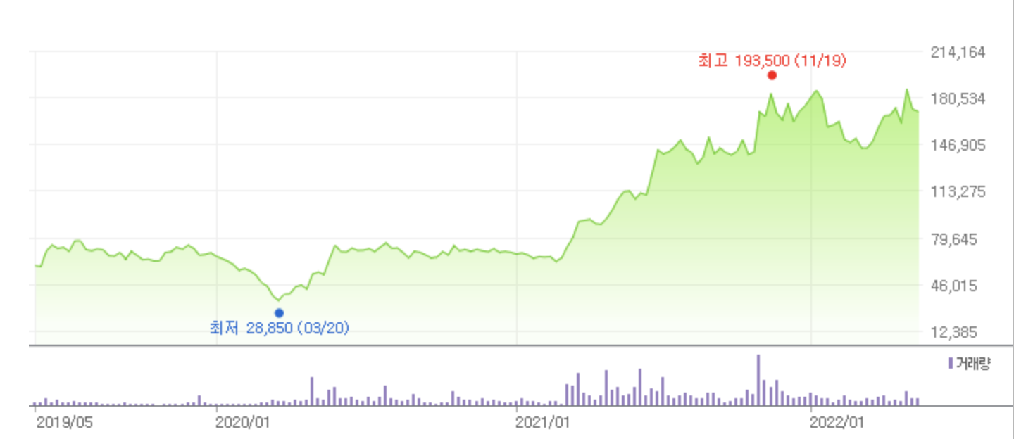 골프존 최근3년 주가차트 뿐만 아니라 해외여행이 막히자 소확행, 스몰 럭셔리를 원하는 많은 mz세대가 골프로 유입되었고