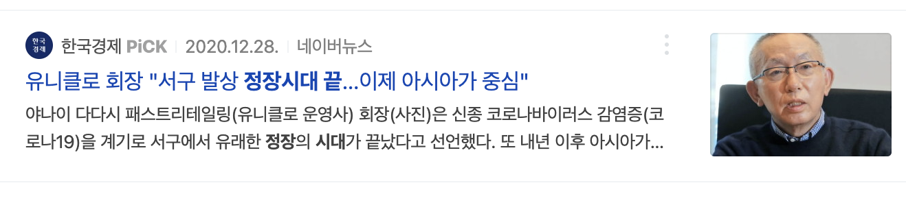 유니클로의 회장 야나이 다다시는 정장 시대가 끝났다는 발언을 했다.