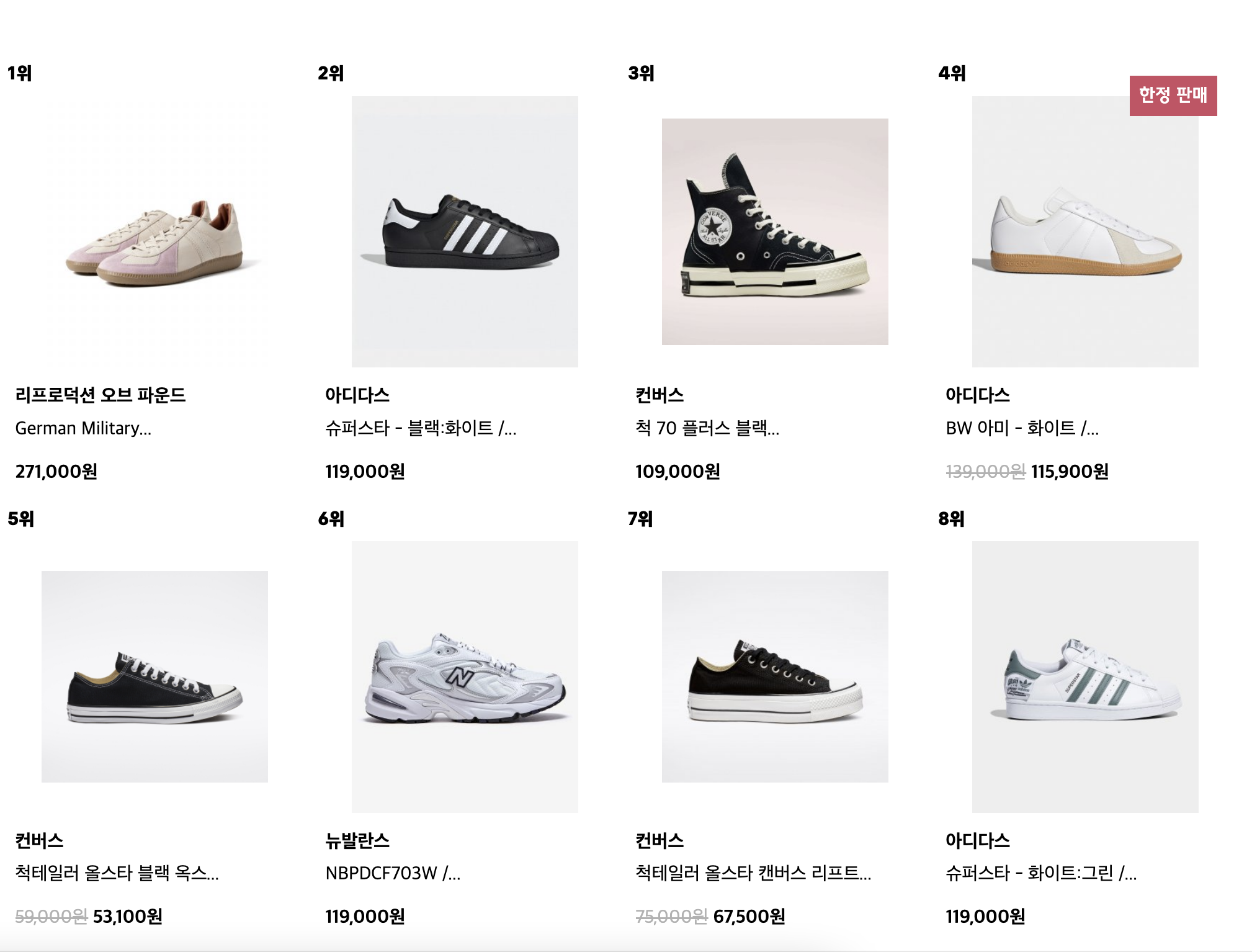 이 글을 쓰는 현재 무신사 스니커즈 랭킹을 보면