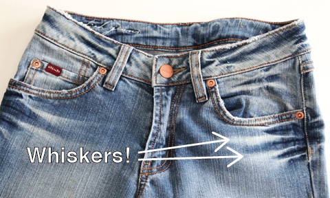 먼저 데님의 전면부에 나타나는 페이딩을 휘스커라고 부르는데