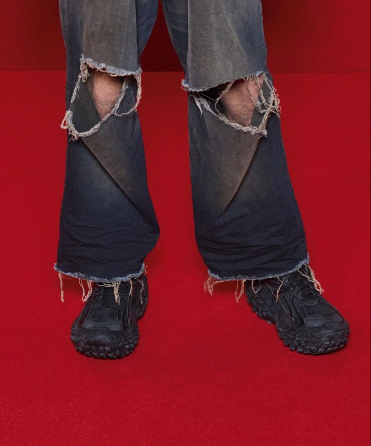발렌시아가의 웨이브로고 후드티와 와이드한 핏의 데미지 데님